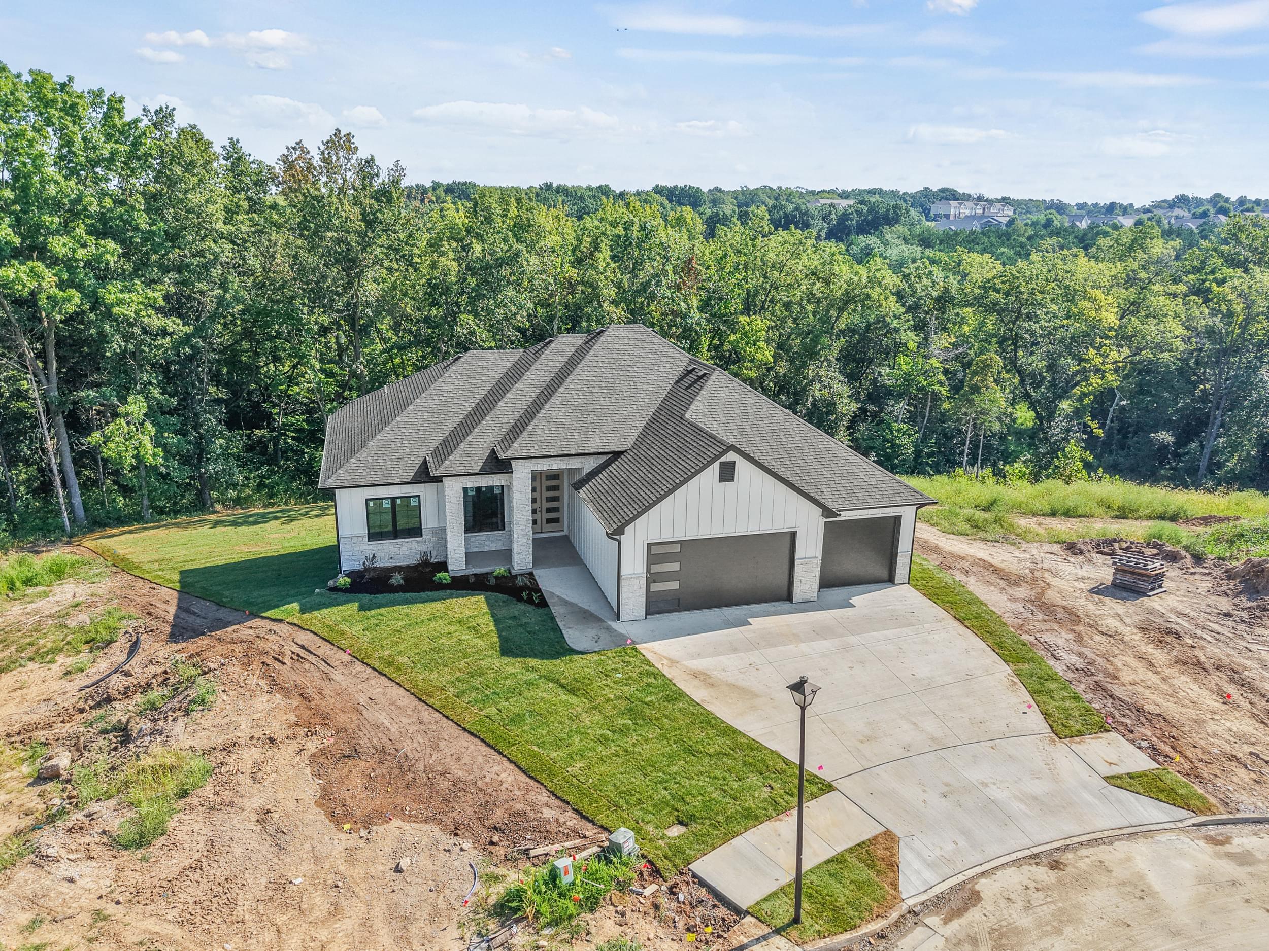 This stunning new ranch walkout in Legacy Farms sits on one of the community’s rarest lots—tucked at the end of a cul-de-sac with a peaceful wooded backdrop. Offering 3,300 finished sq ft, the home features 5 bedrooms, 3.5 baths, and a 3-car garage, blending luxury and livability. Step through double front doors into an airy interior with 11’ ceilings, a split-bedroom layout, and an open-concept design filled with custom touches. The kitchen impresses with a center island, walk-in pantry, tall soft-close cabinetry, and a built-in drop zone and office nook. Expansive 7’ windows frame wooded views, and the finished lower level adds a family/rec room with a bar area, generous storage, and a John Deere room. Outdoor living shines with a screened porch and covered patio overlooking the trees. Enjoy Legacy Farms amenities—pool, clubhouse, walking trail, sport court, and community lake—all near Mill Creek, John Warner, and Rock Bridge schools.