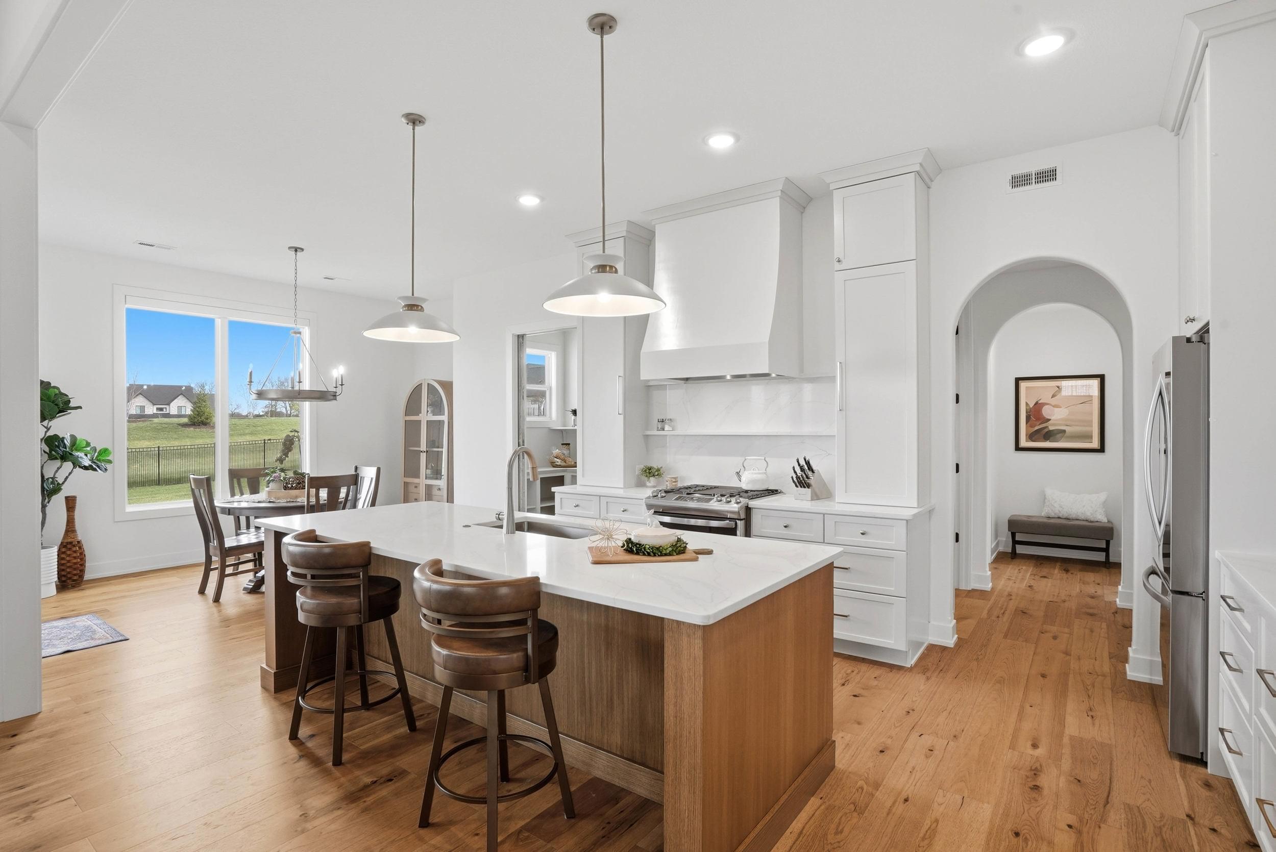 Nestled in the heart of Old Hawthorne, this Anderson-built, custom 1.5-story home combines elevated design with a resort-style lifestyle, including optional access to an 18-hole golf course, pool, dining, and fitness programs. Inside, wood floors lead to a dramatic living room with 15' vaulted ceilings, wood beams, a gas fireplace, and expansive windows overlooking the screened porch and fenced backyard. The open kitchen features quartz countertops, ceiling-height cabinetry, dual ovens, a gas cooktop, a custom vent hood, and a walk-in pantry with repurposed pocket doors, while the adjoining dining area keeps meals connected. A French door office offers a polished work-from-home space, and two main-level suites provide flexibility for guests or multigenerational living. The primary suite includes a freestanding soaking tub, custom shower, dual sinks, and direct access to the closet and laundry. Upstairs, three bedrooms, two baths, and a large family room create space for play or relaxation, making this home a perfect blend of custom craftsmanship and the Old Hawthorne lifestyle.